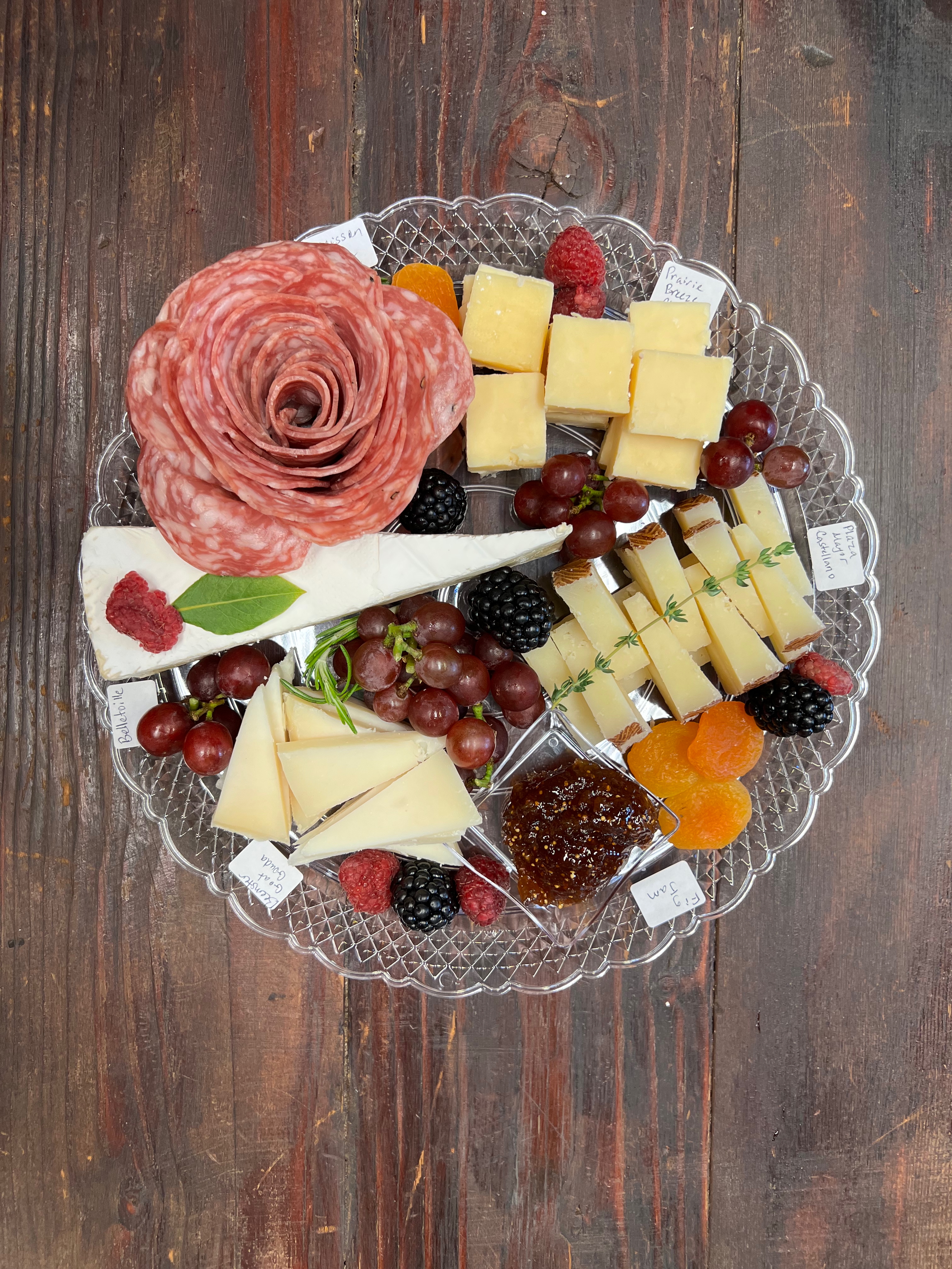 We can accommodate platters of any size, whether it’s an intimate evening for two, a large office party, or anything in between. Bring your favorite plate or borrow one of ours. Each platter is beautifully arranged with complementary fruits, herbs, condiments, and more.